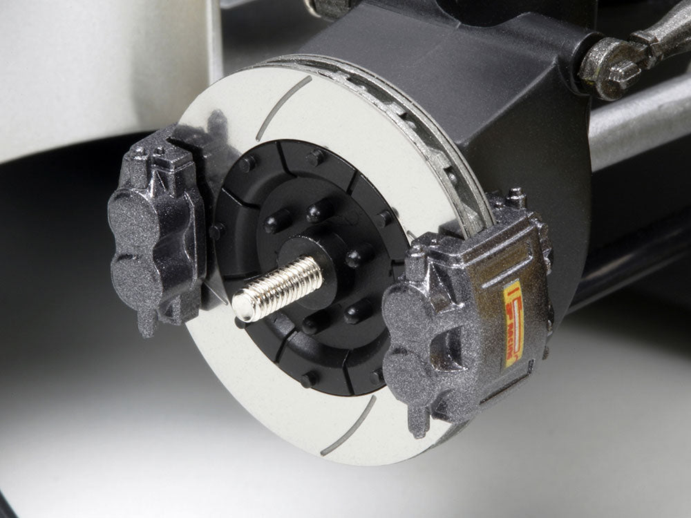 1/12 scale plastic model assembly kit. Length: 389mm, width: 184mm. Super detailed turbocharger 6-cylinder engine and transmission. Front and rear suspension equipped with coil springs are movable. Screw-attached cowlings are detachable to show interiors such as frame structure and cooling system even after assembly. The steering wheel turns the front wheels. Side skirts can be moved up and down. Features semi-pneumatic synthetic rubber tires. Comes with metal-plated parts to recreate wings and air intakes, and photo-etched parts to depict radiator, intercooler, oil cooler and brake discs, and metal transfers for use on side mirrors and instrumental panel (new). High-quality decals made by Cartograf are included.