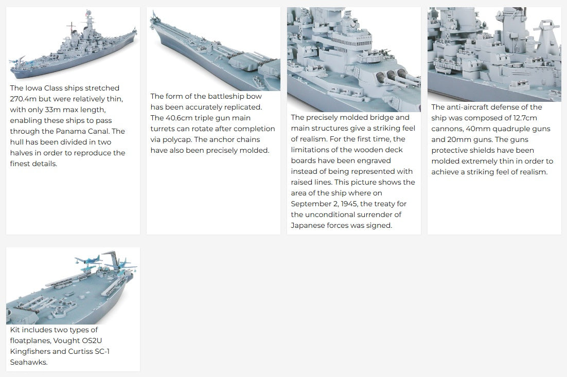 ★A plastic assembly kit of the U.S. Navy Battleship Missouri. ★1/700 scale. Overall length: 386.5mm, width: 47mm ★The long and narrow form of USS Missouri's hull has been accurately replicated. ★Missouri characteristics such as the main structure coupled with the front funnel have been reproduced. ★The hull has been divided in two halves in order to reproduce the finest details. ★The finest details of the main structure and the masts have been accurately recreated. ★The main turrets can rotate after completion via polycap. ★Equipment such as armament including 40mm and 20mm guns are sharply reproduced. ★Kit includes two types of floatplanes, Vought OS2U Kingfishers and Curtiss SC-1 Seahawks.