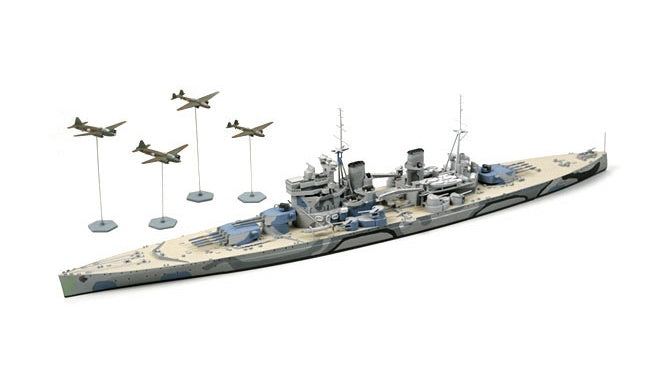The British Battleship Prince of Wales was the second ship of the King George V class. Soon after her completion in March 1941, she was involved in the historic hunt for the German battleship Bismarck. In October she was deployed to South-East Asia to fortify the important British post of Singapore. However, her short career of a mere 9 months came to a dramatic end when intercepted by Japanese bombers in what was to be known as the Battle of Malaya. Tamiya is proud to add the Prince of Wales as she stood during this historic naval battle to our high quality Water Line Series. Kit also features Japanese planes Type 96 "Nell" and Type 1 "Betty" attack bombers for a complete set to accurately recreate battle scene.