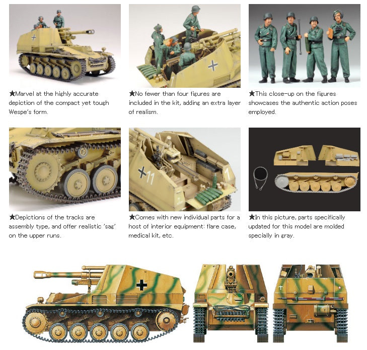 ★This is a 1/35 scale plastic model assembly kit. Length: 143mm, width: 63mm. ★The compact Wespe form is accurately captured. ★Open top fighting compartment features parts for rack, radio, ammo and flare cases, and more. ★Assembly type tracks feature one-piece straight sections. Upper runs depict realistic sag. ★Comes with markings for 26th Panzer Division and 29th Panzer Grenadier Division. ★Includes 4 figures total: commander, gunner and two loaders.