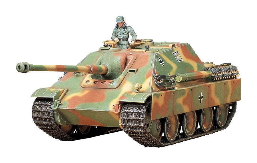 The German tank destroyer Jagdpanther used the proven Panther medium tank chassis fitted with a fixed fighting compartment and a powerful 88mm gun. A late production variant of the Jagdpanther now comes as a 1/35 scale plastic assembly kit model. You can choose to assemble a Jagdpanther produced from May to December 1944 or from December 1944 onwards. The fighting compartment interior features superb details including the main gun loading part, bulkhead, and commander's seat. Movable escape hatch as well as open/closed selectable hatches provides the model with a greater presence. Kit includes parts to depict die-cast type exhausts as well as exhausts with flame dampers. A commander figure is also included.