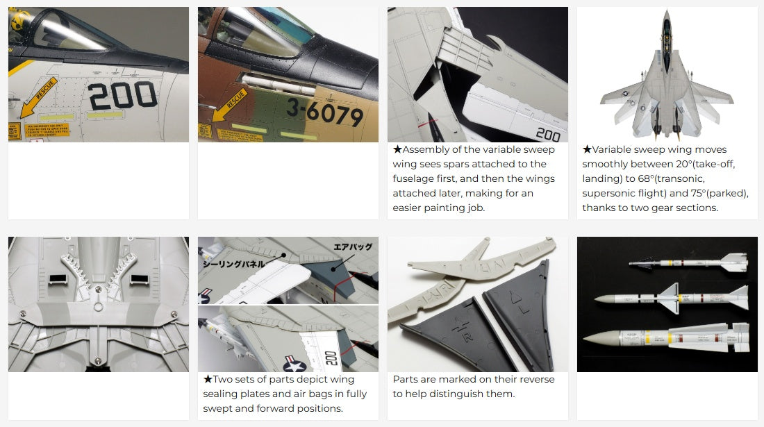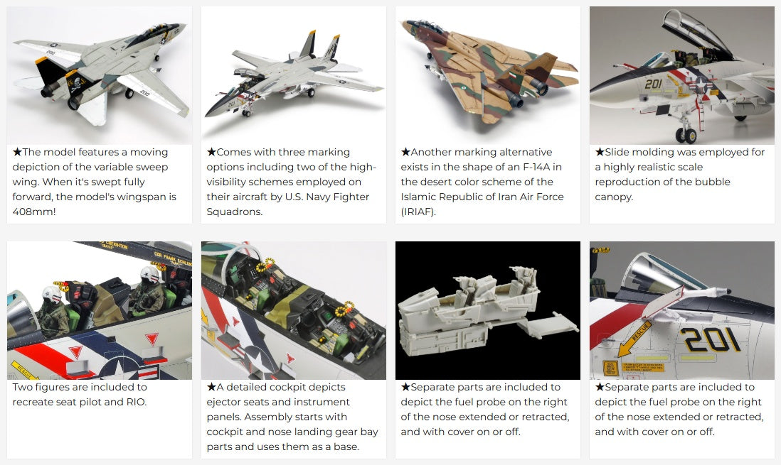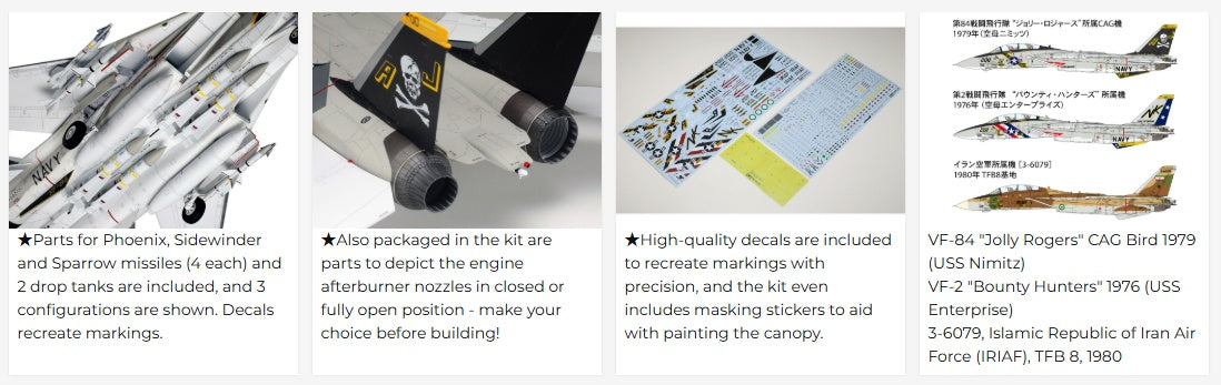 ★This is a 1/48 scale plastic model assembly kit of the Grumman F-14A Tomcat. Fuselage length: 398mm, Maximum Wingspan: 408mm. ★Designed with access to real F-14A Tomcats for superlative accuracy. ★Features moving depiction of variable sweep wing. ★2 sets of parts - interchangeable after completion - depict sealing plates and air bags with wing in fully swept and fully forward positions. ★Slide molding was used to ensure highly realistic canopy, air intake side and fuselage side sections. ★Poly caps allow movement of horizontal stabilizers. ★The model offers a choice of parts to depict open or closed engine afterburner nozzles. ★Separate parts are included to depict the fuel probe on the right of the nose, and the ladder on the left. ★Comes with two U.S. marking schemes and one for the Islamic Republic of Iran Air Force.