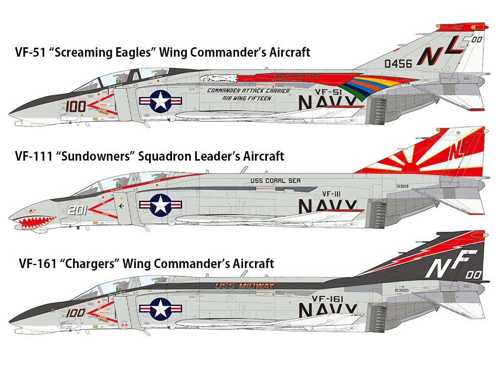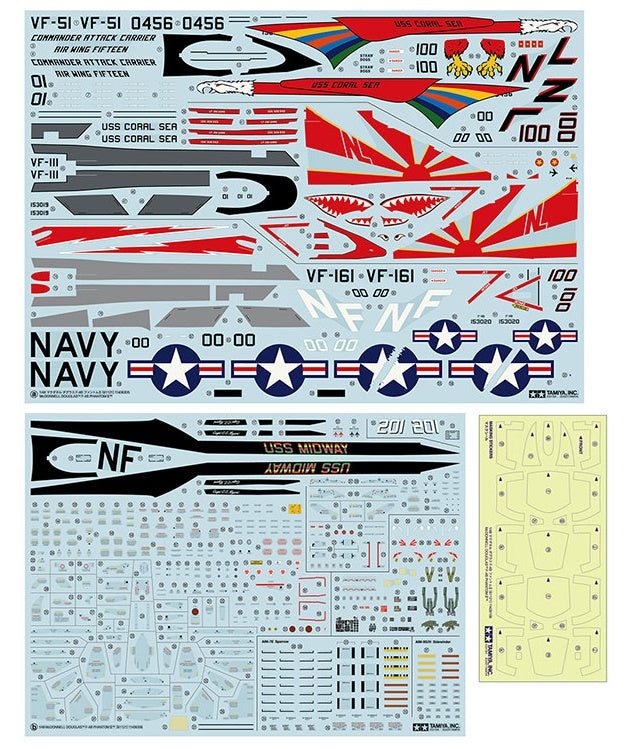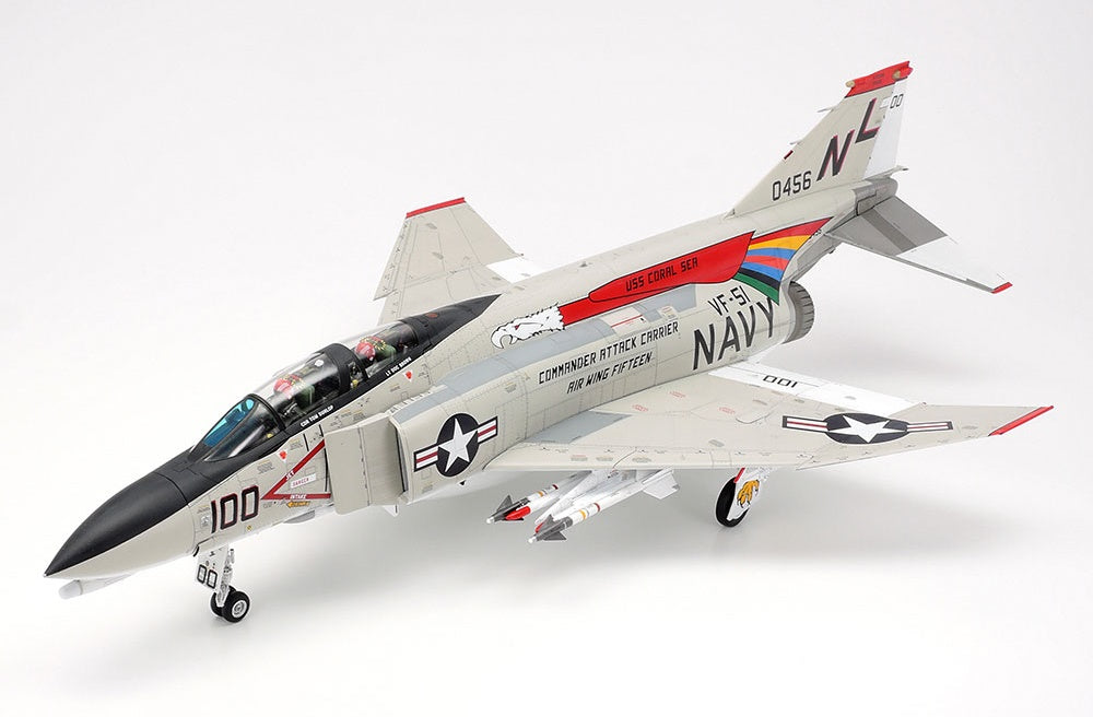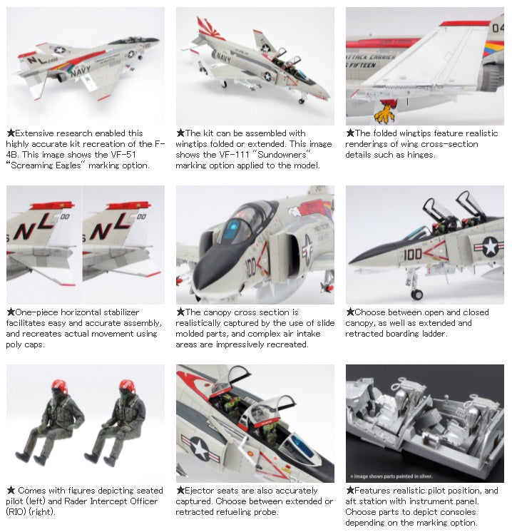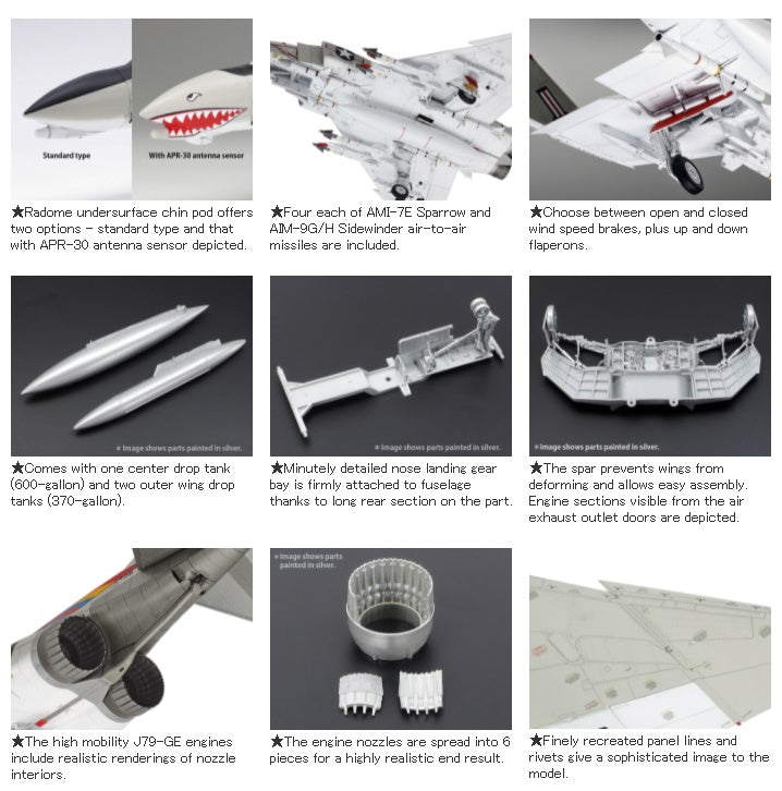This is a 1/48 scale plastic model assembly kit. Fuselage length: 370mm, wingspan: 244mm. ★Exhaustive studies of the actual aircraft enabled this precise recreation of the distinctive form. ★The parts breakdown offers ease of assembly. ★J79-GE-8 engine nozzles, cockpit, and landing gear bays are realistically recreated. ★Choose between folded and extended wingtips. ★One-piece horizontal stabilizer right and left sides move in concert. ★Choose between open and closed canopy, and extended and retracted refueling probe/boarding ladder. ★Different types of antennae and cockpit consoles can be chosen depending on the marking option selected. ★Air-to-air missiles (AIM-7E Sparrow and AIM-9G/H Sidewinder) and two types of drop tanks are included. ★Includes 2 sitting crew figures, 3 marking options, and masking stickers.