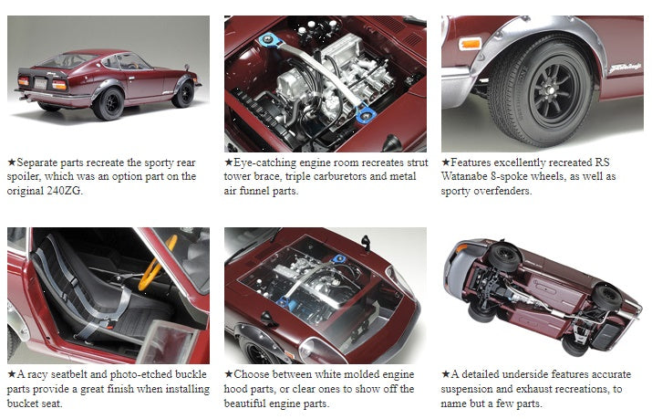 ★This model recreates the Fairlady 240ZG, released in Japan in 1971, fitted with a host of tune-up parts typical of the era. ★1/12 scale. Length: 356mm, width: 151mm, height: 101mm. ★Features recreations of RS Watanabe 8-spoke wheels. ★The powerful straight-6 engine is depicted with triple carburetors and metal air funnel parts, photo-etched carburetor insulation pieces, plus a strut tower brace. A clear engine hood is also included. ★The realistic interior includes accurately recreated roll bar, plus a choice of standard or bucket seats. Photo-etched parts depict buckles on the bucket seat racing belts. ★Opening doors, engine hood and tailgate parts. ★Moving suspension. ★Front wheels move in tandem with steering wheel operation. ★Includes parts to recreate rear spoiler.