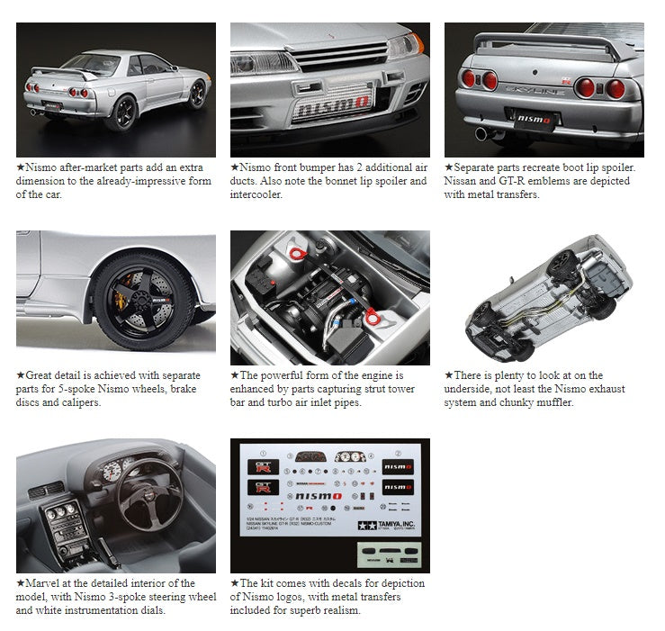 ★1/24 scale. Length: 190mm, width: 75mm. ★The model recreates the Skyline GT-R (R32) with customizing parts centered around Nismo items such as 5-spoke wheels, spoiler and mud guards. ★Realistic interior features parts for Nismo 3-spoke steering wheel, plus more!