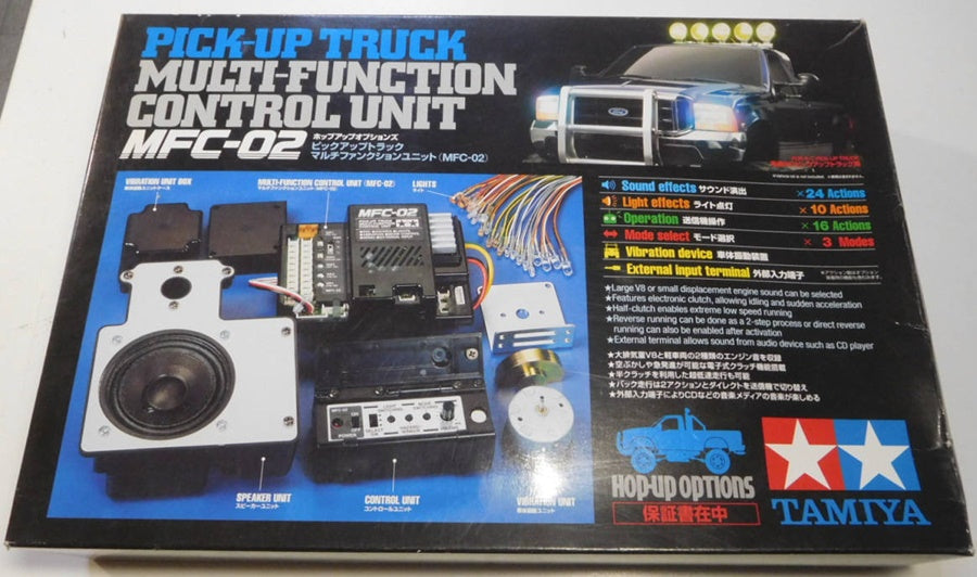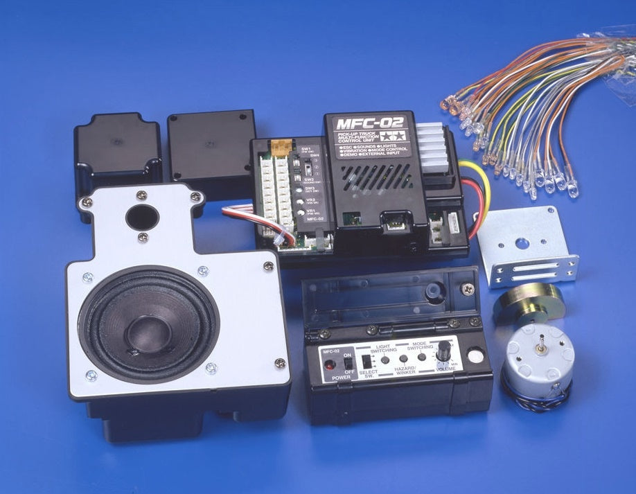 Fit this MFC-02 unit to your 1/10 R/C pick-up truck model for supremely authentic lights, sounds, and even vibrations, all of which are coordinated with model actions. A multitude of engine sounds are recreated, from ignition and idling noises, to shift changes and even alterations to pitch as throttle increases. Two flavors are provided to choose between - a big V8 and a smaller turbocharged engine. Vibration levels also change in unison with the increases in imagined RPM. An electronic clutch is installed, which can be manipulated using transmitter control sticks.