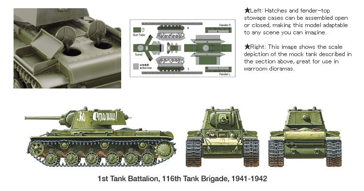 It is said that German front line troops were provided with wooden and paper models of the KV-1 in a scale of around 1/20, to help identify the tanks and formulate counter-strategies. This kit includes a version in miniature 1/35 scale on the painting guide to cut out and use in dioramas of tactical meetings and the like.