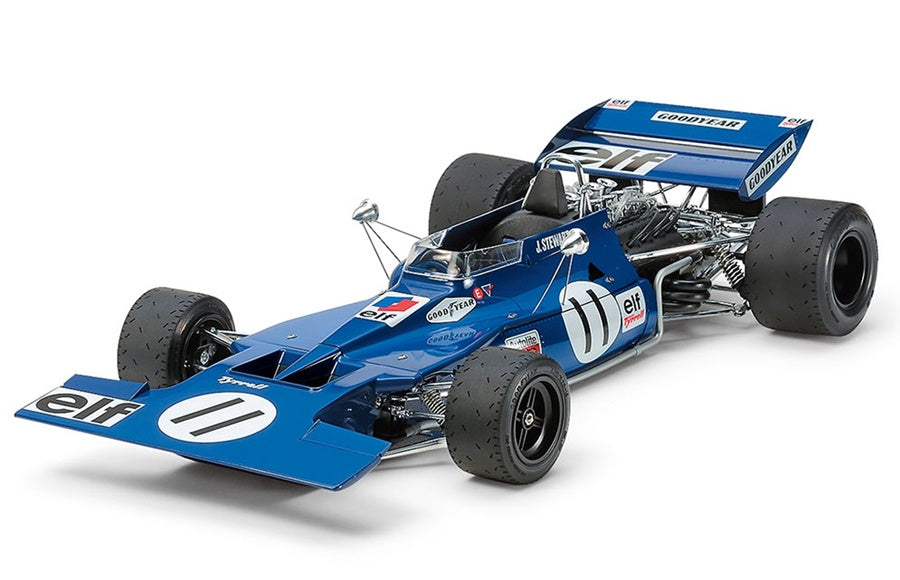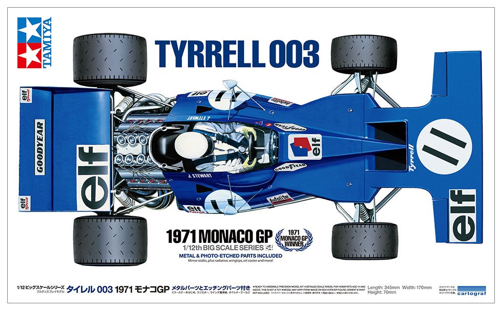 Riviera Legend The Tyrrell team made their Formula One bow in 1968 using the Matra Ford and quickly achieved excellent results, with a drivers' championship for Jackie Stewart the next season. From the 11th race of 1970 in Canada, the team debuted the in-house designed 001, which paved the way for the 003 and 002 cars piloted in 1971 by Stewart and François Cevert respectively. While a unique integrated front wing and nose with radiator just below caught the eye, the 003 utilized an otherwise orthodox, reliable setup. Stewart achieved 6 wins in 11 races including the Monaco GP, more than enough for that season's drivers' and constructors' titles. Now, the car is immortalized in Tamiya 1/12 scale.